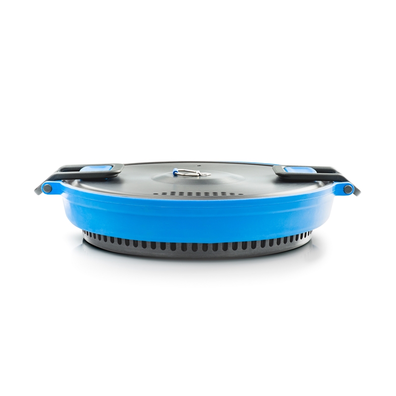 Save space, save fuel – which’ll save even more space – and get cooking. The Escape’s hybrid design combines the packability and light weight of silicone with a highly efficient hyper-conductive anodized base. It cooks 30% faster – meaning less fuel – and takes up 53% less space in your pack. That’s a lot. The design details are super smart. The lid doubles as a strainer and has integrated silicone thumbpads to help prevent burns. Dual bail handles make pick-up easy, then fold out of the way and lock the lid in place. The silicone has graduations molded in, so measurements are always accurate, and – if you want – you can nest other Escape tableware pieces inside. The Escape HS is maximum pot for minimal space.