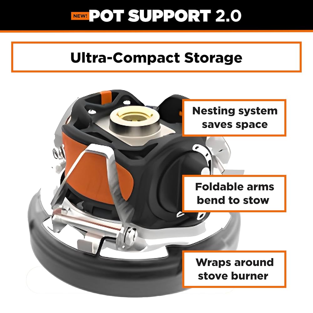Transform your Jetboil fast boil system into a backcountry kitchen with the new Pot Support 2.0. The fold-out support arms allow you to use our Summit Skillet, FluxRing Cook Pots, or a variety of traditional pots and pans on your Jetboil system. The new design allows for easier attachment to the burner and stows neatly by attaching to the underside of the burner assembly.